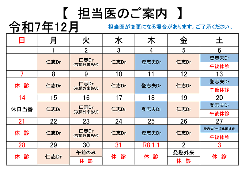 あきもと整形外科クリニック2025年12月の診療カレンダーです。
