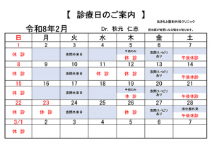 あきもと整形外科クリニック2026年2月の診療カレンダーです。