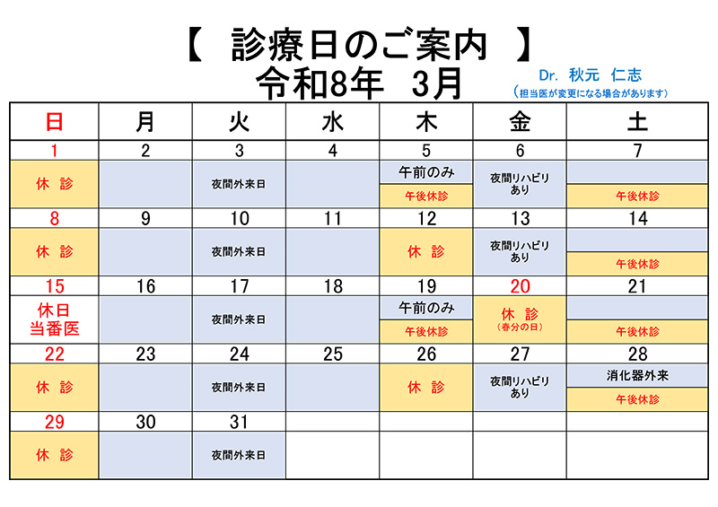 あきもと整形外科クリニック3月の診療カレンダーです。